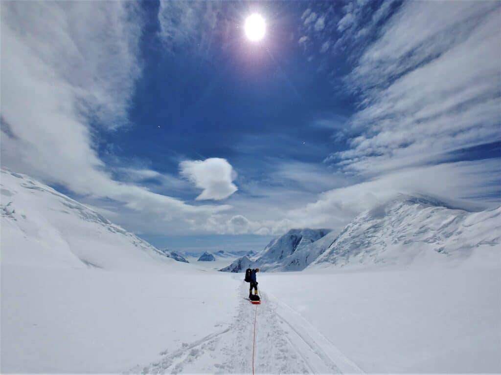 L’Alaska, cette terre sauvage, extrême jusqu’à son emplacement sur une carte du monde, est l’un des lieux de notre planète où l’aventure totale semble encore envisageable. Méconnue sous bien des aspects et peu visitée hormis sur sa côte sud, elle offre des perspectives d’aventure nordique sans fin. Entre amis, nous avons eu le bonheur et l’ardeur d’y tracter nos pulkas en juin et sur des glaciers dont l’ampleur dépasse l’entendement.
