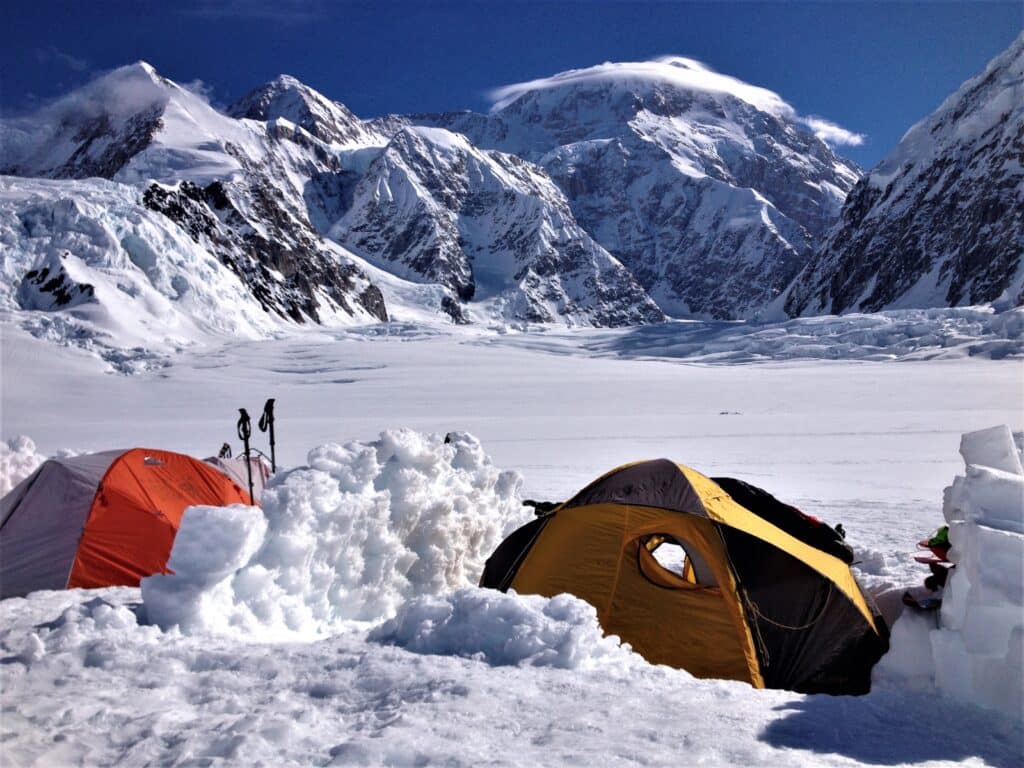 Il est deux heures du matin en cette neuvième nuit. Je sors de la tente. Il y faisait -18°C. Le temps s’arrête. Il me semble que tout le monde dort et j’ai l’impression que tout s’est apaisé. Seule la montagne ne se repose jamais. Par-delà les cimes, d’immenses nuées blanches s’envolent : le vent façonne à sa guise la neige fraîchement tombée. Je me dresse alors face au glacier que nous avons sillonné pendant cinq jours. Le Mont Foraker le surplombe et me fait face. De jour, il est immense et puissant. En cette nuit, il a revêtu ses plus beaux habits. Ceux de lumière. D’intenses lueurs roses dansent sur les pentes de son immense face Ouest. Je reste bouche-bée face à tant de beauté. Une larme m’échappe. Ces couleurs de la nuit polaire, entremêlant jaune doré et rose éclatant, m’offrent une parenthèse enchantée dans cet environnement de rudesse.