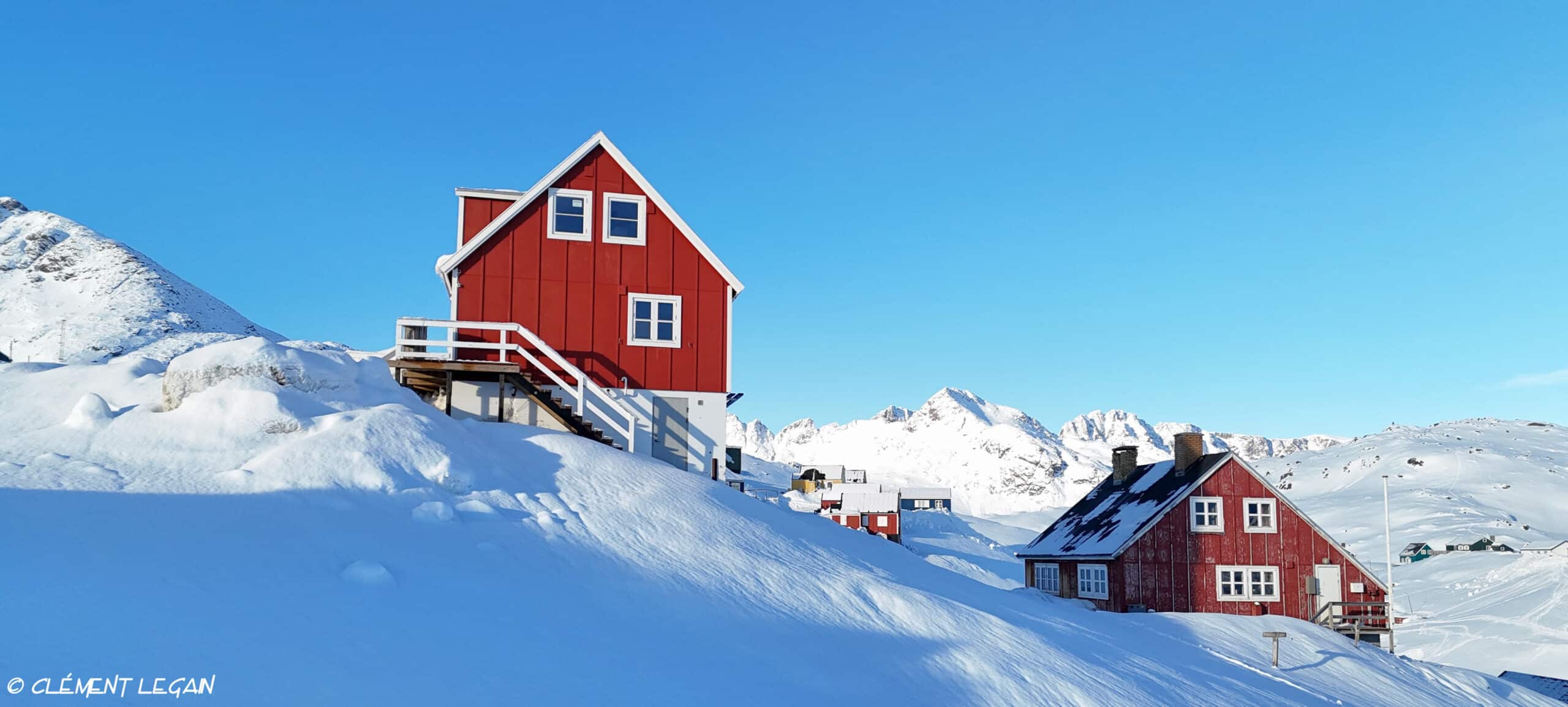 Maisons colorées, peaux de phoques séchant sur les balcons, aboiement des chiens de traineaux Groenlandais… se mêlent dans un décor hivernal où le blanc et le bleu se partagent les teintes d’une nature silencieuse.