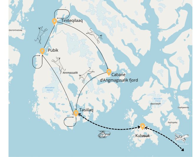 Notre itinéraire nous mène de villages en cabanes isolées, à l’aide du moyen de transport local, le traîneau. Des expériences uniques, qu’ont vécues bien avant nous des explorateurs de renom, tel que Paul-Emile Victor, qui a hiverné plusieurs fois dans la région d’Angmagssalik.